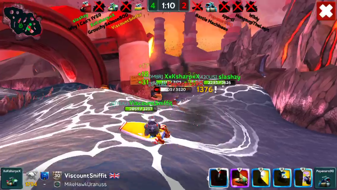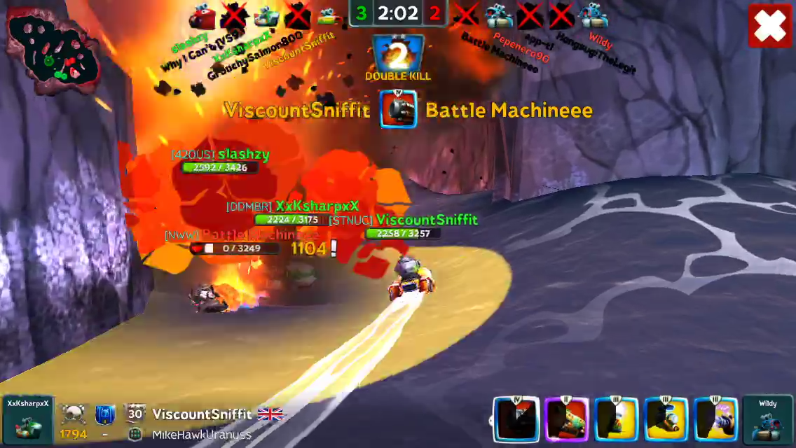 Game bafore that, I landed this one on a speeder, which felt great because he kept stunning me. When I finally managed to stun him back and then 1310! damage, I was totally like “Hah! Take that!”, and then another 600 from exploding cannon... he ran away after that (which was lucky, because I Nitroed into a wall and got stuck for ages :( )