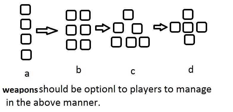 1.) weapons should make optional, in below manner.....i am suffering, unable to play shooter at all, unable to press with my fingers, as my hand was large....kindly..plz look into this.... if it is made optional then it will be good for all players...ipad players working fine we are suffering with small mobiles....in 5.5inch its not that good at all...