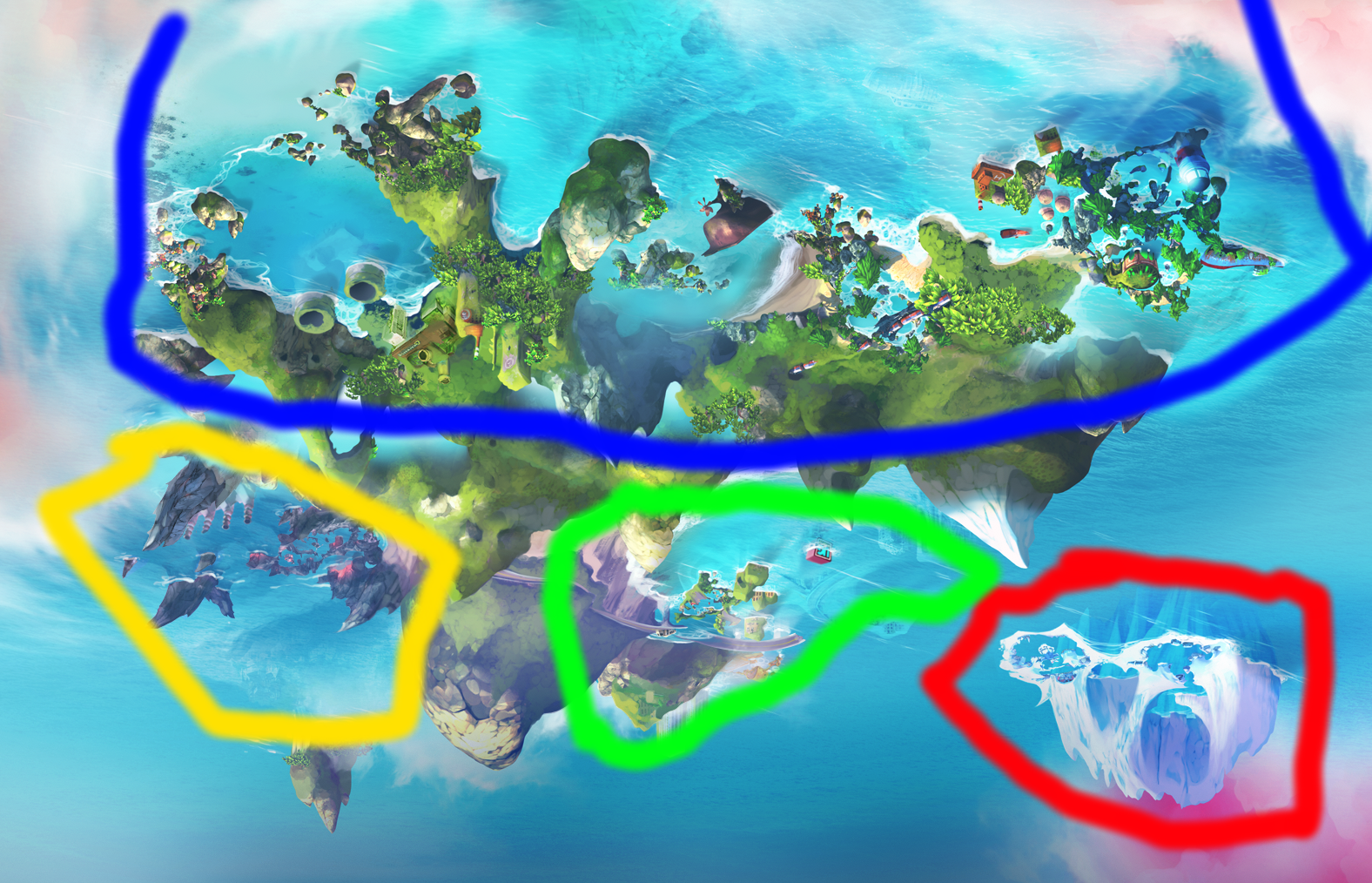 From this, I have sectioned off the island into regions, for ease of lorekeeping. For each region, I've included our knowledge/theories and what maps it includes.