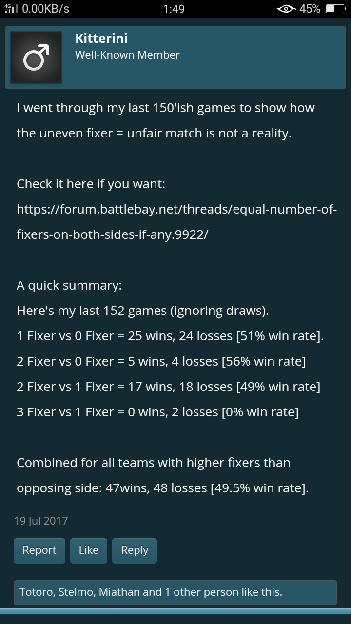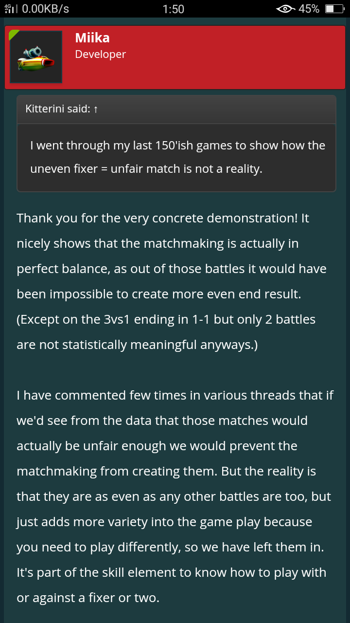 @Miika maybe if you could show these individuals the statistics that you've been mentioning to the community so that they can visually see it. I believe that will give them more of a reason to believe that it is fair. To be honest, I would love to be the middleman and be on both sides. I believe that the matches are fair but I wouldlove to be on the community side to actually see the statistics. I understand that you are a developer and "should" be a reliable source, however just stating something without the physical proof is hard to trust 100%