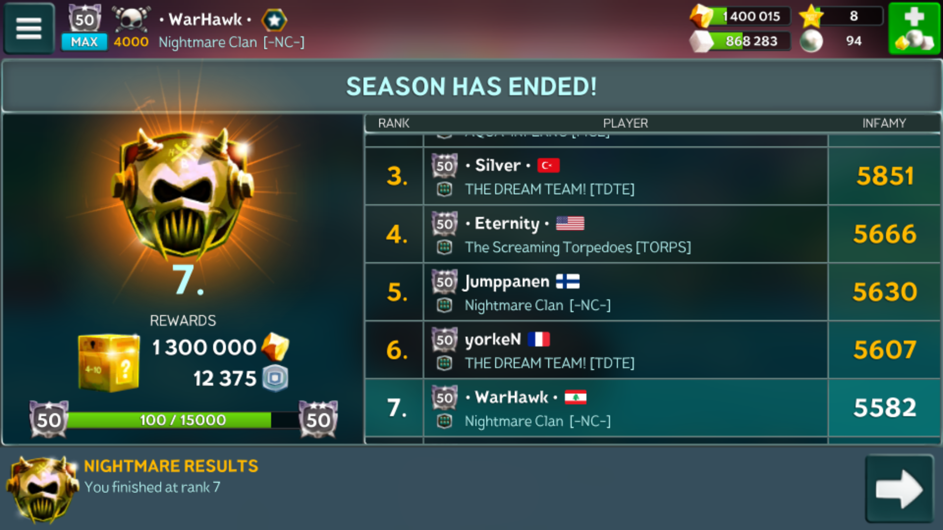As shown above, these are my position and infamy in the last season in nightmare league.