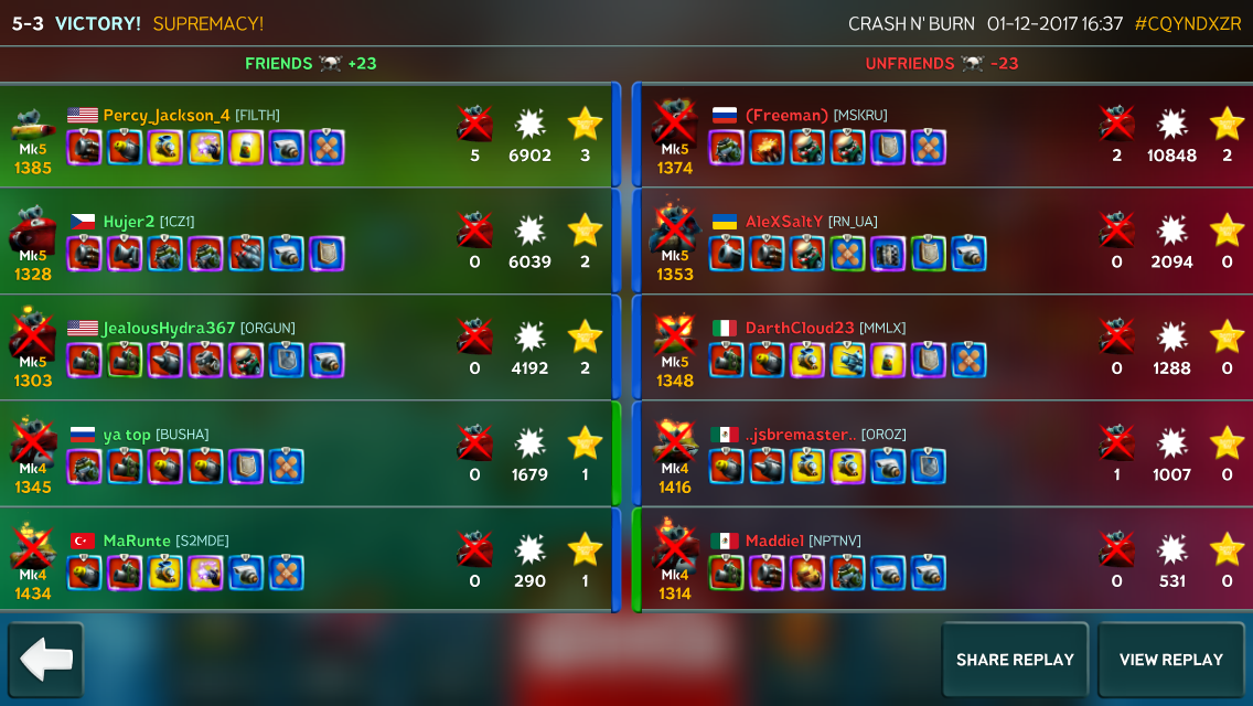 IMG_1825.PNG Pentakill, here are the results. I can't share the video, but it involved me connecting all my torpedoes. @TheAntiSnipe maybe you could view the video using the tag on the replays website? :) thanks in advance